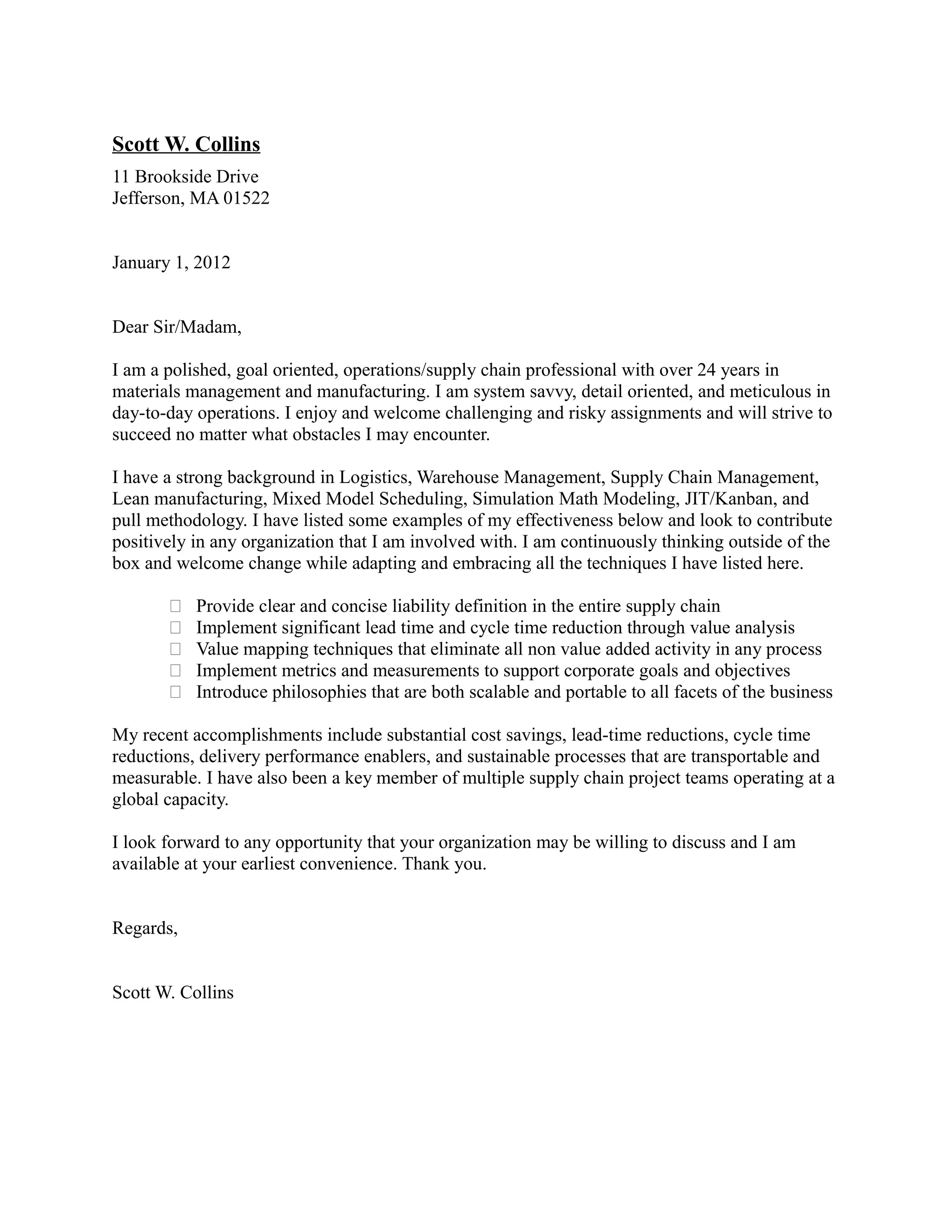 Scott Collins is a 24-year operations and supply chain professional seeking a new opportunity. He has strong experience in logistics, warehouse management, lean manufacturing, and supply chain modeling. Collins aims to contribute positively through clear liability definitions, lead time and cycle time reductions, and metrics that support corporate goals. His recent accomplishments include cost savings, reduced lead times, improved delivery performance, and sustainable processes.