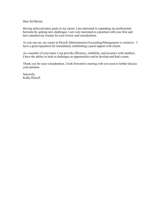 The applicant is seeking a new professional challenge and is interested in a position at the firm. She has an extensive career in payroll administration, accounting, and management. She has a great reputation for establishing rapport with clients and can provide efficiency, reliability, and accuracy. She also has the ability to develop and lead a team by viewing challenges as opportunities. She looks forward to discussing the position further in a future meeting.