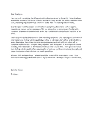 Danielle is completing an Office Administration course and has developed skills in communication, answering inquiries, and working independently. She has experience creating documents like reports and newsletters using Microsoft programs. Danielle has worked at a chiropractor's office for three years, answering phones, handling confidential information, and dealing with customers, where she learned to work independently and provide excellent customer service. She believes her skills and experience would make her an asset to the employer.