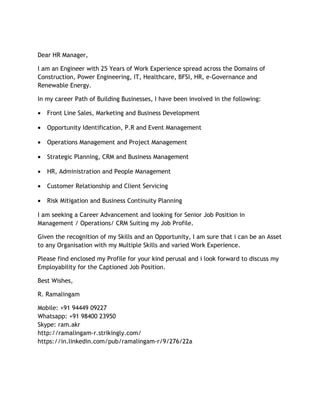 R. Ramalingam is an engineer with 25 years of experience across various industries including construction, power, IT, healthcare, finance, government, and renewable energy. He is seeking a senior management, operations, or customer relationship role utilizing his experience in business development, project management, strategic planning, HR, client services, and risk mitigation. Ramalingam believes his diverse skills and experience would make him an asset to any organization.