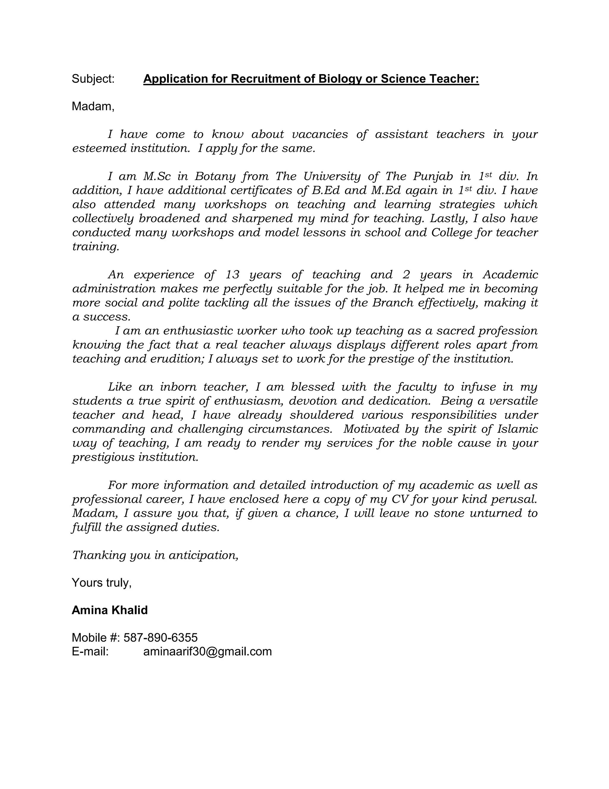 The applicant is applying for an open biology or science teacher position. She has an M.Sc. in Botany from The University of The Punjab with first division honors. Additionally, she has B.Ed and M.Ed degrees, also with first division honors. She has 13 years of teaching experience and 2 years of academic administration experience. She sees teaching as a sacred profession and is ready to serve the institution and motivate students with enthusiasm, devotion and dedication.