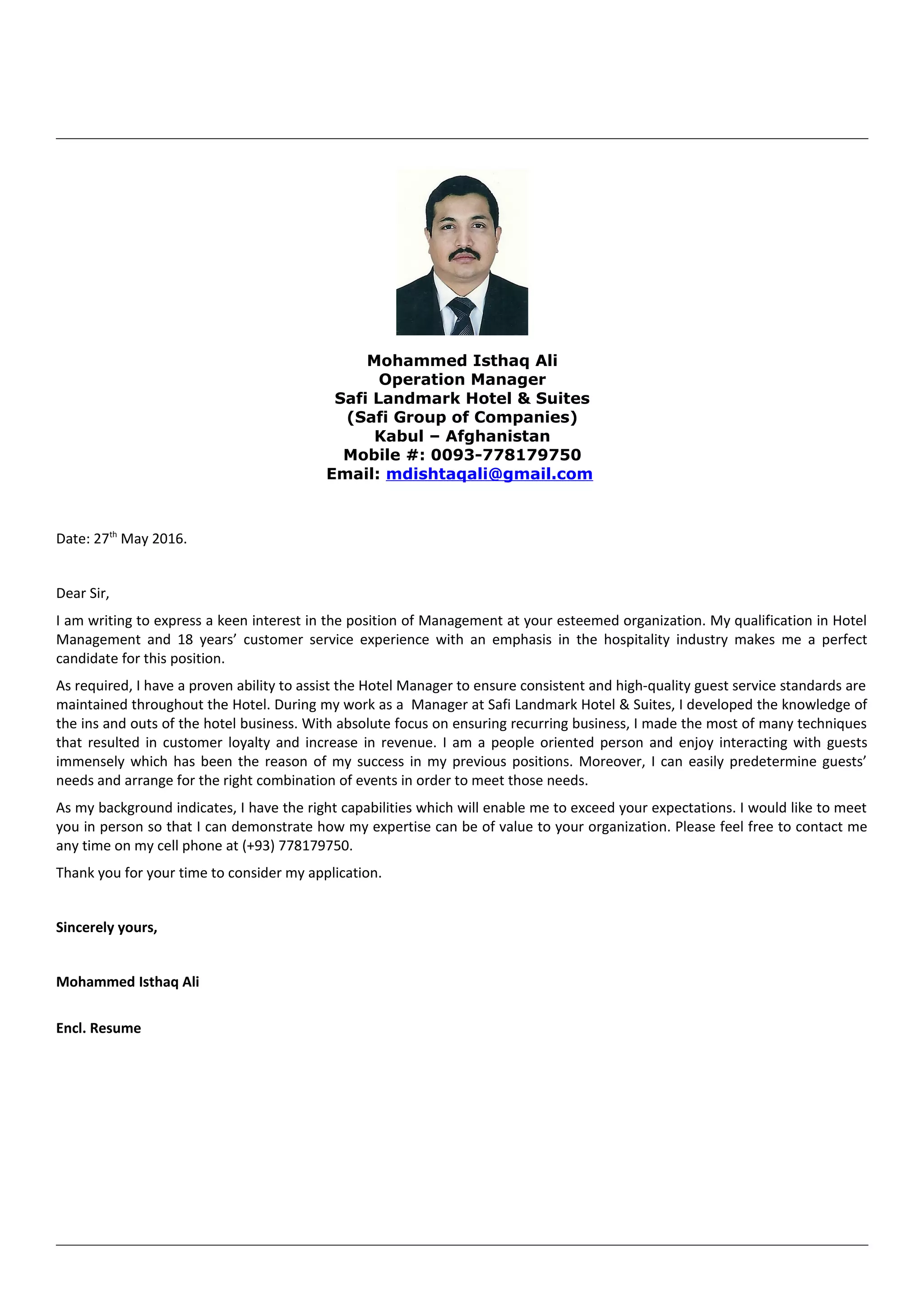 The document is a cover letter and resume from Mohammed Ishtaq Ali applying for a hotel operations manager position. He has over 18 years of experience in customer service and hospitality management, most recently as operations manager at Safi Landmark Hotel & Suites in Kabul, Afghanistan. He details his responsibilities managing front office operations, rooms inventory, staffing, and ensuring high quality guest service. He believes his expertise would enable him to exceed expectations for the position.