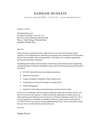 Saddam Hussain applied for an Associate Signal Engineer position at GE India Technology Centre Pvt. Ltd. He has a B.Tech degree in Electronics and Communications Engineering with specialization in Industrial Automation. His background includes experience with SCADA software/firmware development, industrial automation, emulators/simulators/static analysis tools, and project management. He is eager to discuss how he can best serve the company and looks forward to an interview.