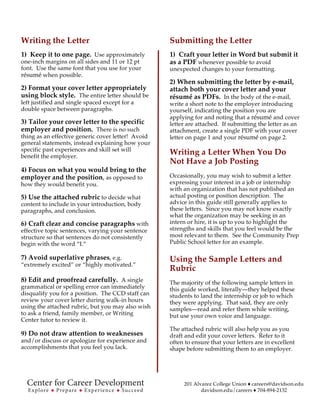 This document provides guidance on writing effective cover letters. It explains that a cover letter introduces a job candidate and highlights their qualifications for a position. The document offers tips for researching the employer, analyzing the job description, reviewing relevant experiences, and addressing the letter to a specific contact. It provides instructions on formatting, content, proofreading, and submitting the cover letter. Sample cover letters are also included.