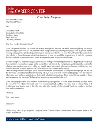 This document provides a template for a cover letter with three paragraphs. The first paragraph introduces the applicant and the position they are applying for. The second paragraph discusses why the applicant is interested in the company and how their skills match the job requirements. The third paragraph restates their interest, refers the reader to their resume, provides contact information, and thanks the employer for their consideration. The template recommends highlighting 3-5 key qualifications from the job description and relating relevant experiences from their resume.