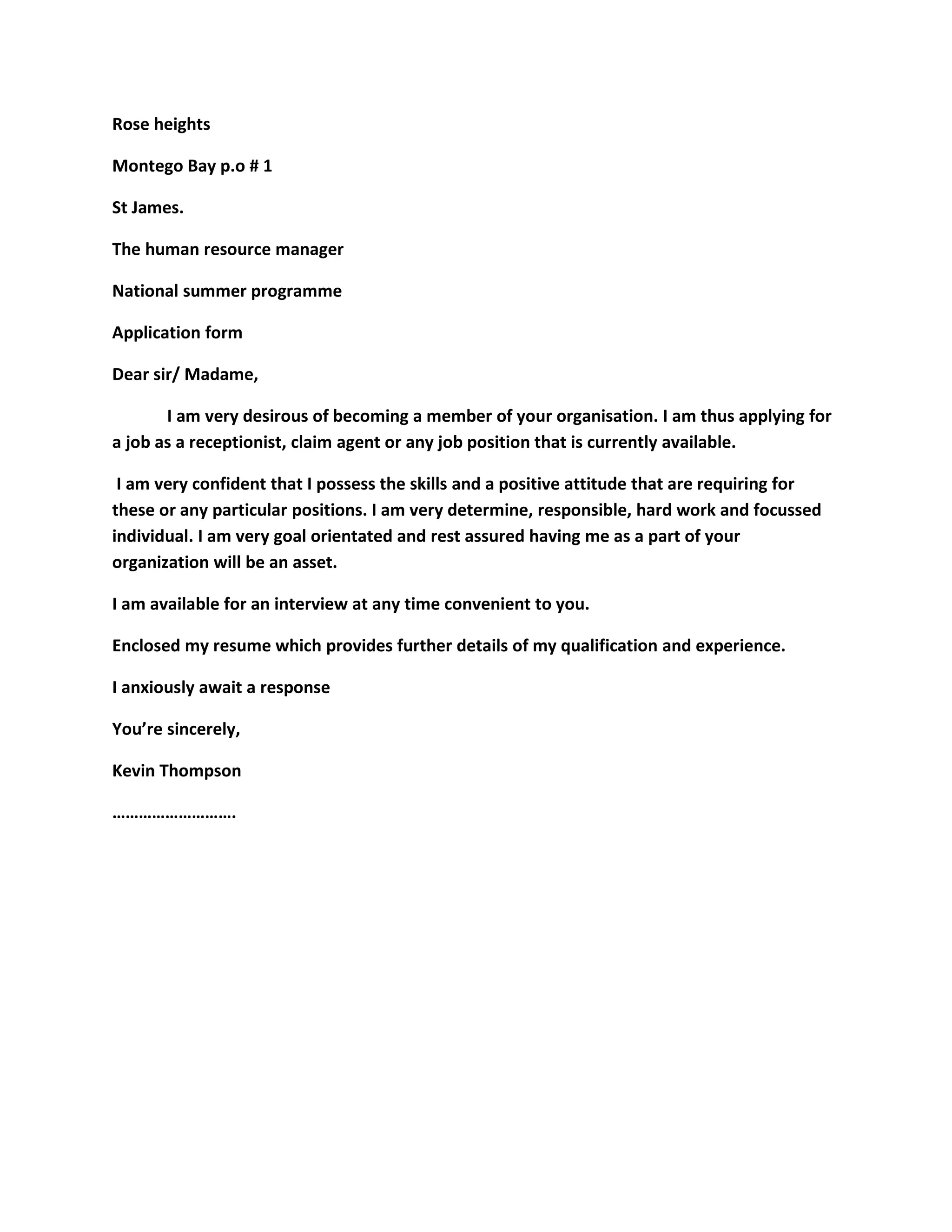 Kevin Thompson is applying for any available position such as receptionist or claims agent with the National Summer Programme. He believes he has the required skills and a positive attitude. Kevin emphasizes that he is determined, responsible, hardworking, and goal-oriented. He is available for an interview and has enclosed his resume for further details on his qualifications and experience.