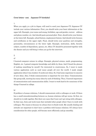 This document provides instructions for completing a Japanese CV (resume) when applying for jobs in Japan. It should include basic personal information, education and employment history, licenses/certificates, and personal qualities/strengths. Photos are also typically included. The CV is submitted together with other application materials and brought to job interviews. Sample CVs are provided that describe computer science education and skills gained in college, interest in creativity and developing applications, and the importance of communication skills. The second sample discusses how to handle human relations issues at work through open communication or forming work teams if a colleague cannot be gotten along with, in order to complete work efficiently.