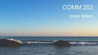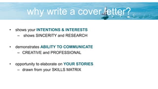 The document provides guidance on writing effective cover letters. It explains that a cover letter shows your intentions, interests, ability to communicate, and allows you to elaborate on your skills and experiences. It should demonstrate how you meet the job requirements in terms of what you can do, are interested in, and are a good fit for. The document also distinguishes resumes from cover letters, noting cover letters focus more on the employer while resumes focus on your background and experiences. It provides examples of cover letter components like the opening, skills matching, and closing and emphasizes integrating your brand and resume formatting into the cover letter.