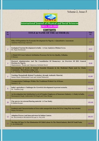 This document is the contents page for the May 2012 issue of the International Journal of Physical and Social Sciences. It lists 21 articles on various topics, along with information about the journal's editorial board.