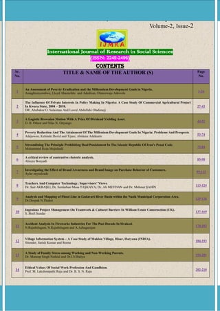 The document is the May 2012 issue of the International Journal of Research in Social Sciences, Volume 2, Issue 2, featuring various articles on topics including poverty eradication in Nigeria, the influence of private interests in policy-making, and socio-economic issues in India. It includes assessments of rural employment schemes, family stress studies, and the effects of brand awareness on consumer behavior, among other subjects. The journal is an open-access, peer-reviewed publication, comprising contributions from international authors and researchers.