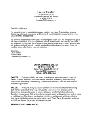 Laura Easter is applying for an open position at the hiring company. She has 10 years of experience in marketing, customer service, sales and administrative roles. Her resume details her skills in these areas and she believes she can be a valuable addition to the company. She has held various roles including marketing assistant, server, and beauty consultant. She is requesting an interview to further discuss the position and how she is well qualified.