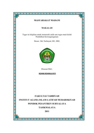Makalah ini membahas tentang masyarakat madani dan peran umat Islam dalam mewujudkannya. Masyarakat madani didefinisikan sebagai masyarakat yang ramah, toleran, dan menghargai hak asasi manusia. Karakteristiknya meliputi solidaritas, keadilan sosial, dan partisipasi masyarakat. Umat Islam memiliki peran penting dalam membangun masyarakat madani melalui peningkatan kualitas sumber daya manus
