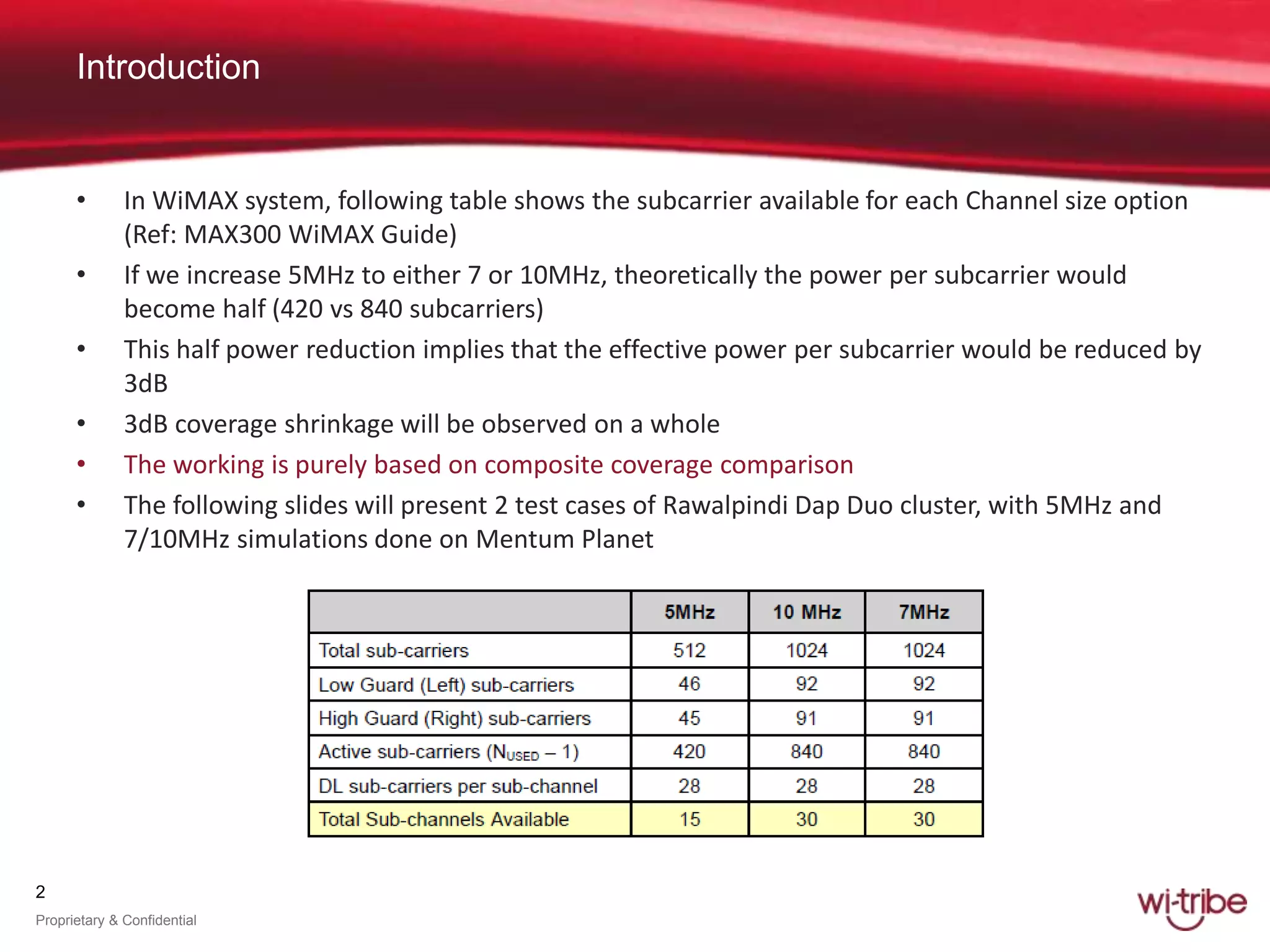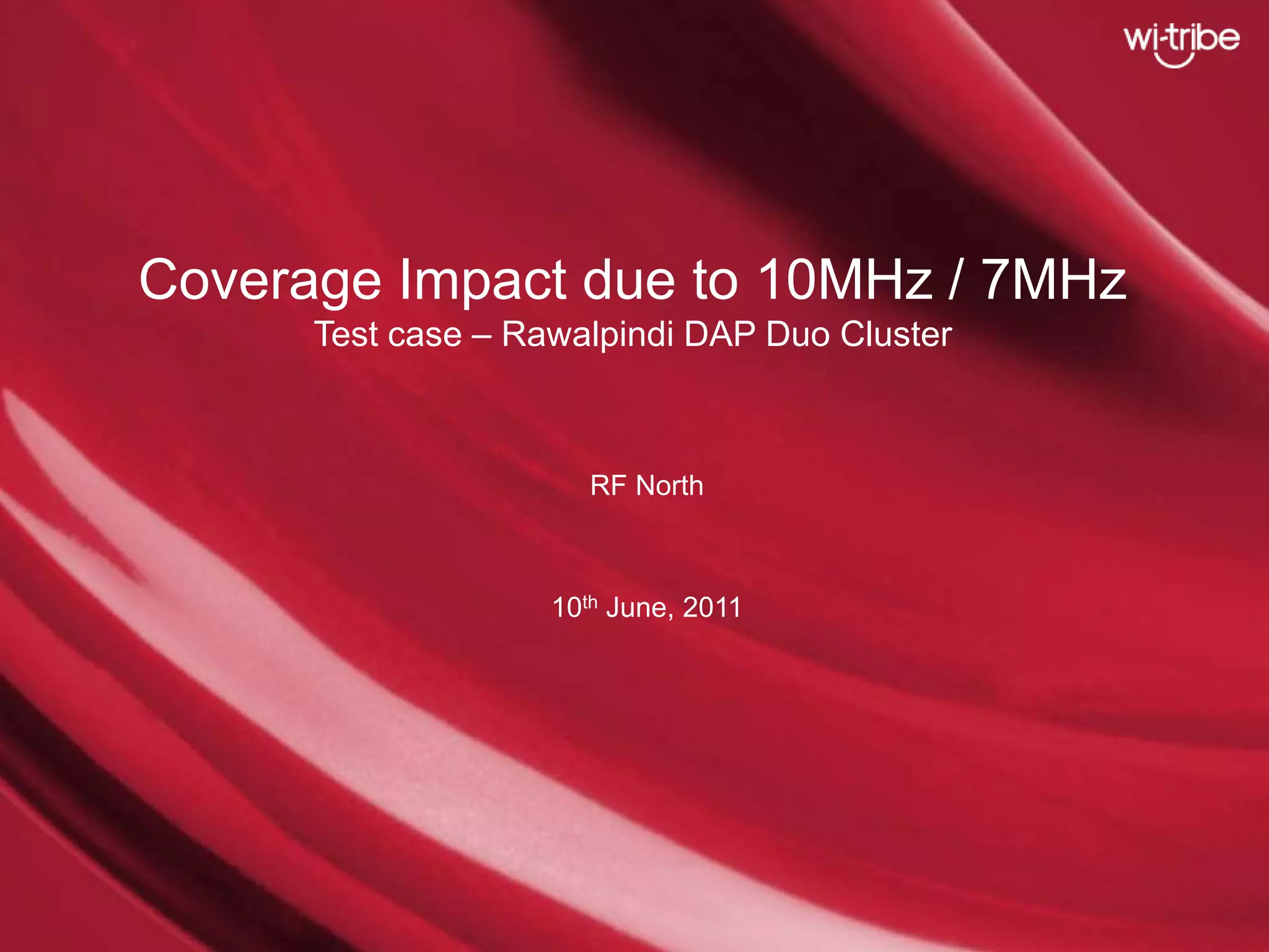 The document compares network coverage simulations for a wireless network operating at 5 MHz, 7 MHz, and 10 MHz channel sizes. Simulations were conducted for two areas covered by 11 and 12 base station sites. The results show a slight degradation in coverage at the cell edges when increasing from 5 MHz to 7/10 MHz, with a maximum coverage decrease of around 3%. Overall, the impact on network coverage is considered very small when increasing the channel size to 7 or 10 MHz.