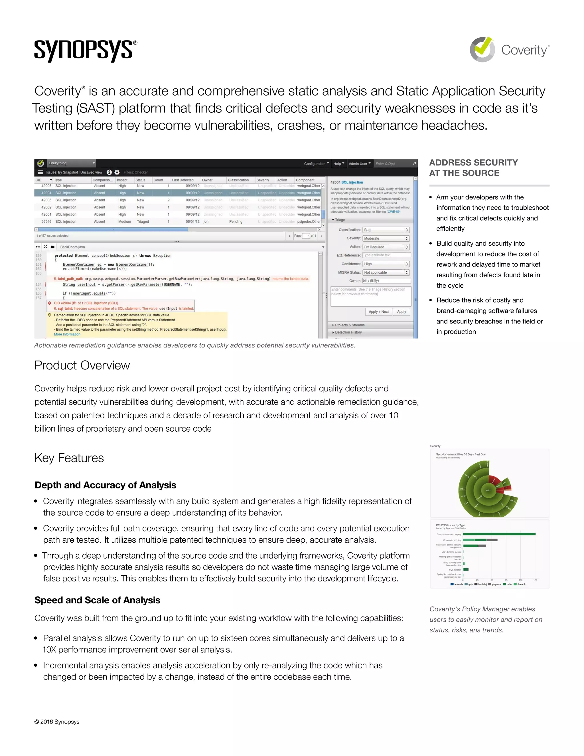 Coverity is a static analysis and software security testing platform that identifies critical defects and vulnerabilities in code during development. It provides deep and accurate code analysis, actionable remediation guidance to help developers address issues, and seamlessly integrates into development workflows and tools. Coverity scales to large codebases and teams and helps reduce risks and costs from defects found late in the development cycle.