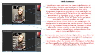 To create a magazine cover, the document summarizes editing an image to fit around the masthead without overlapping, enlarging and adjusting the lighting of the image. Font and colors were chosen and boxes were added behind text and as borders to make the cover line more interesting. Artist names were added to a banner and cover lines were individually written and spaced compactly around the image. A cropped barcode and publication details were also added.