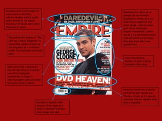 The document analyzes and compares the layout and design of three film magazine covers (Empire and Fangoria) and three film posters (Scream, The Blair Witch Project, and Sorority Row). Some key similarities across the magazines and posters include placing the masthead, tagline, or film title near the top to attract attention. Images are used prominently and text is designed and placed intentionally to stand out against backgrounds without overlapping important elements. Production details are included below titles to provide information to readers and viewers.