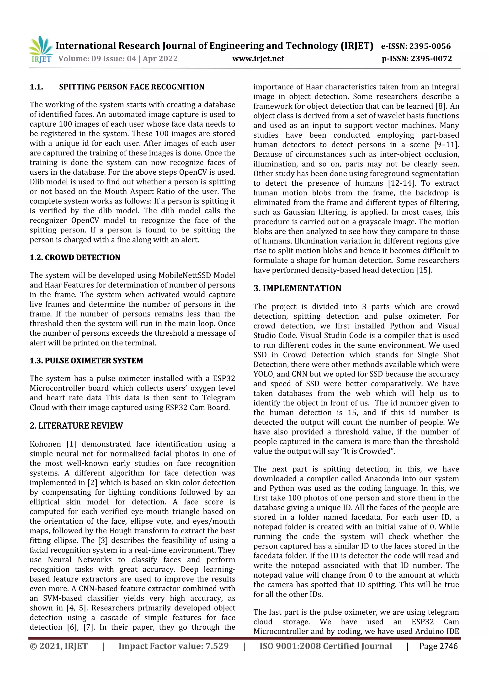This document describes a project that uses computer vision techniques for Covid norms compliance. It includes three parts: 1) crowd detection using OpenCV to count people and detect crowds, 2) face recognition to identify people spitting and issue fines, and 3) a pulse oximeter to measure users' oxygen and heart rate which is sent to Telegram cloud. The system is implemented using an ESP32 microcontroller, camera, and other hardware. Experimental results show it can accurately count people in images for crowd detection, identify unique users spitting through facial recognition, and transmit biometric data to the cloud.