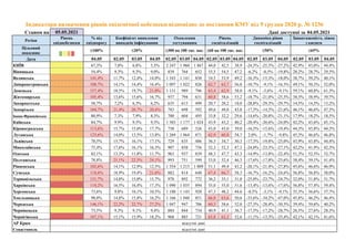 епідемічної небезпеки відповідно до постанови КМУ від 9 грудня 2020 р. № 1236 Станом на 05.05.2021 Дані доступні за 04.05.2021 Регіон Рівень епіднебезпеки % від епідпорогу Коефіцієнт виявлення випадків інфікування Охоплення тестуванням Рівень госпіталізацій Динаміка рівня госпіталізацій Завантаженість ліжок з киснем Цільовий показник █ █ █ █ ≤100% ≤20% ≥300 на 100 тис. нас. ≤60 на 100 тис. нас. ≤50% ≤65% Дата 04.05 02.05 03.05 04.05 02.05 03.05 04.05 02.05 03.05 04.05 02.05 03.05 04.05 02.05 03.05 04.05 КИЇВ 2 67,3% 7,0% 6,8% 5,5% 2 247 1 960 1 867 44,0 42,5 38,9 -24,5% -25,5% -27,2% 42,9% 43,0% 44,4% Вінницька 2 54,4% 9,3% 9,3% 9,0% 839 764 652 55,5 54,5 47,2 -6,2% -8,5% -19,8% 28,2% 28,7% 29,5% Волинська 3 141,4% 11,7% 12,4% 14,0% 1 343 1 141 830 54,5 53,9 49,2 -16,5% -15,3% -18,0% 38,7% 39,2% 40,1% Дніпропетровська 3 108,7% 14,1% 14,4% 16,4% 1 097 1 022 826 62,7 62,7 56,8 -10,7% -9,1% -16,5% 49,1% 50,3% 52,0% Донецька 3 157,4% 18,5% 19,7% 21,0% 1 131 989 796 63,4 62,9 58,0 -9,1% -5,6% -9,1% 59,1% 60,8% 61,3% Житомирська 2 105,4% 13,6% 15,6% 16,7% 937 794 631 60,8 58,6 53,2 -18,7% -21,0% -25,5% 38,3% 38,9% 39,7% Закарпатська 2 58,7% 7,2% 6,3% 6,2% 635 615 499 20,7 20,2 18,0 -28,8% -29,3% -29,7% 14,5% 14,5% 15,2% Запорізька 4 104,7% 21,4% 20,7% 20,4% 783 698 592 49,6 49,0 43,8 -17,5% -14,5% -21,6% 46,1% 46,6% 47,3% Івано-Франківська 2 80,9% 7,3% 7,9% 8,3% 700 604 495 33,8 32,2 29,6 -14,6% -20,8% -21,1% 17,9% 18,2% 18,5% Київська 2 84,7% 9,9% 9,5% 9,3% 1 303 1 177 1 024 43,9 43,2 40,2 -20,4% -20,6% -24,0% 42,2% 43,6% 45,1% Кіровоградська 3 113,6% 15,7% 15,0% 17,7% 738 689 526 43,0 43,0 39,0 -16,5% -15,6% -19,4% 44,3% 45,8% 44,5% Луганська 3 125,6% 14,0% 13,5% 13,8% 1 269 1 064 871 62,0 60,8 54,7 2,0% -1,7% -9,8% 45,3% 46,6% 46,8% Львівська 2 70,5% 15,7% 16,1% 17,1% 729 635 486 36,3 34,7 30,3 -17,3% -19,8% -25,0% 43,9% 43,8% 44,4% Миколаївська 2 75,4% 17,6% 16,1% 16,3% 907 858 756 52,3 52,3 47,3 -24,0% -23,5% -27,1% 42,2% 41,9% 42,3% Одеська 2 82,1% 13,3% 11,8% 11,7% 963 937 839 48,3 47,7 43,3 -14,9% -13,8% -22,4% 51,3% 52,3% 52,7% Полтавська 4 78,8% 21,1% 22,5% 24,1% 993 751 599 53,0 52,4 46,3 -17,6% -17,8% -25,6% 38,4% 39,1% 41,4% Рівненська 3 102,6% 14,1% 12,9% 12,5% 1 354 1 215 1 009 51,1 49,4 43,2 -20,1% -21,4% -27,8% 45,6% 46,6% 46,9% Сумська 4 118,6% 18,9% 19,4% 21,6% 882 814 640 67,4 66,7 58,3 -16,7% -16,2% -24,6% 56,8% 56,8% 58,0% Тернопільська 3 131,7% 14,8% 15,0% 15,7% 978 892 772 36,2 35,1 31,8 -25,0% -23,7% -24,7% 32,0% 31,8% 31,7% Харківська 4 110,2% 16,5% 16,4% 17,3% 1 090 1 035 894 55,0 55,0 51,6 -13,4% -13,6% -17,6% 56,8% 57,4% 59,4% Херсонська 2 73,6% 9,8% 10,1% 10,5% 1 180 1 143 920 47,3 48,2 44,6 -8,5% -3,1% -9,1% 35,3% 36,6% 37,7% Хмельницька 4 98,0% 14,8% 15,8% 16,2% 1 166 1 048 851 66,0 63,6 50,6 -33,6% -34,2% -47,0% 45,8% 46,2% 46,4% Черкаська 3 146,1% 22,2% 22,7% 27,2% 1 047 947 706 60,3 58,6 52,0 -27,5% -28,4% -30,5% 39,4% 39,6% 40,2% Чернівецька 2 73,5% 9,3% 9,1% 9,4% 884 844 734 40,9 41,1 36,7 -17,5% -17,2% -28,7% 26,5% 27,6% 28,3% Чернігівська 4 107,1% 15,1% 15,9% 18,2% 968 885 721 65,8 63,3 52,6 -11,1% -13,3% -25,4% 42,1% 42,1% 41,6% АР Крим відсутні дані Севастополь відсутні дані