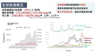 疫情仍然严峻,全球确诊病例达171,439,065,死亡3,692,992。台湾本土病例持续增加,实施三级警戒措施以控制传播,同时扩大社区检测和疫苗接种计划,目标每周接种100万剂。反复变异株传播可能延长疫情,公共卫生措施需要持续强化。