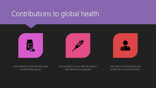 The emergence of HIV led to several important developments in global health: the development of new antiviral and antiretroviral drugs to treat HIV, the development of long term treatments and preventative measures for HIV, and the exposure of discrimination within the healthcare system against at-risk groups like gay men and drug users in the early years of the epidemic.