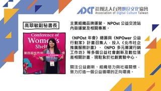 本文探讨了 COVID-19 对非营利组织(NPO)的影响,包括数字转型、内部运营及服务模式的变革。文章强调意识到问题的重要性,并提供数字成熟度和转型咨询的框架。作者关注公益创新与跨域合作,致力于推动台湾地区的数字发展与公益事业。
