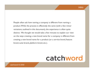 The document discusses the key differences between naming a company versus naming a product. While the overall naming process is similar, company naming involves more senior level stakeholders, aims to accommodate potential shifts in business focus over the long term, and requires an available .com domain name. As a result, company names tend to be more abstract, coined terms rather than descriptive words, in order to satisfy these unique constraints. Product names on the other hand can be more specific since they do not need to accommodate business changes and are supported by an established corporate brand.