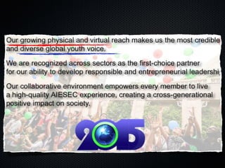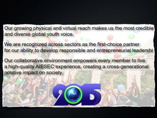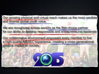 The document discusses AIESEC's vision of developing leadership to achieve a world of peace and fulfillment of human potential. It examines AIESEC's impact model of providing experiential leadership opportunities for young people and whether this is developing the kind of leadership needed today. It encourages AIESEC to create more and better experiences, and not be satisfied, in order to fully achieve its vision of engaging and developing every young person in the world.