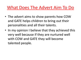 The document discusses an advertisement for COW and GATE baby food that aims to show how their products help nurture children's personalities and talents. It does this through an inspirational and catchy concept of babies appearing to play musical instruments, though randomly. Digital graphics are used effectively to make it seem the babies are playing a song and then the COW and GATE logo pops up at the end.
