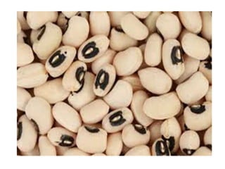 Cowpea is an annual herbaceous legume crop that is well adapted to dry environments. Its botanical name is Vigna unguiculata and it is native to Central Africa or India. India is a major producer of cowpeas, growing them for their green pods, grains, and fodder. Cowpeas are used for human and animal nutrition, as a green manure crop, and for erosion control. They fix nitrogen in the soil. The crop requires warm temperatures between 25-35°C and 300-400mm of rainfall. Common cowpea varieties grown in India include Pusa Sampada, Pusa Rashmai, and Rambha. Cowpea is