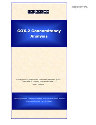 This document describes an analysis of patient data to study the concomitant use of COX-2 inhibitors like Vioxx, Celebrex, and Bextra with cardiovascular drugs. The analysis segmented over 25 million patients taking antiarthritic drugs by the COX-2 inhibitors they used. Properties were defined to categorize patients by the number of scripts for study drugs over 2 years. The results showed that while most patients only had 1 script, some had 17 or more, and of those patients some were also taking ACE inhibitors. The analysis examined the distribution of combined usage of study drugs and control drug classes.