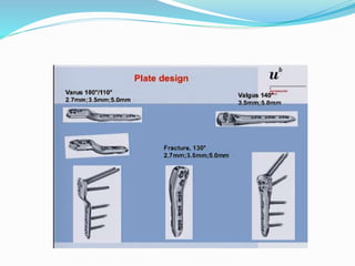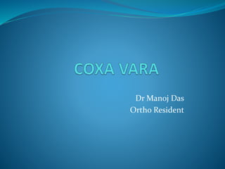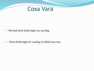 This document discusses coxa vara, which is a hip deformity characterized by an abnormal decrease in the femoral neck-shaft angle. It classifies coxa vara as congenital, developmental, or acquired. Developmental coxa vara is the most common type and is caused by a primary cartilage defect in the femoral neck. Clinical features include limping and pain. Treatment involves corrective valgus osteotomies to restore the neck-shaft angle and relieve stress on the femoral physis. The document describes several techniques for valgus osteotomy including Pauwel's, Borden's, and subtrochanteric osteotomy. The goal of surgery is to stimulate healing of the femoral neck defect and restore normal