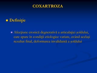 Coxartroza este o afecțiune cronică degenerativă a articulației șoldului, având cauze variate, incluzând forme primitive și secundare. Simptomatologia include durere, poziție vicioasă a membrului inferior și limitarea mobilității, iar tratamentele variază de la metode conservatoare la intervenții chirurgicale. Gonartroza afectează genunchiul similar, având o etiologie multifactorială și necesitând o abordare medicală și chirurgicală adaptată stadiului bolii.