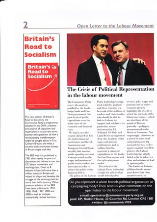 The document is a call to action from the Communist Party, urging the Labour movement to confront public spending cuts, wages, and benefits issues while fostering unity among trade unions. It criticizes the Labour leadership for failing to adequately represent the working class and calls for urgent discussions on the future direction and strategies of the Labour party to resist current economic policies. An upcoming conference is highlighted as a platform for discussing potential resistance and solidarity among left and progressive forces.