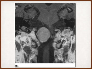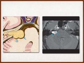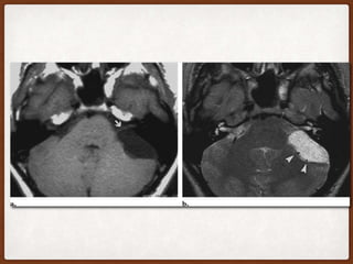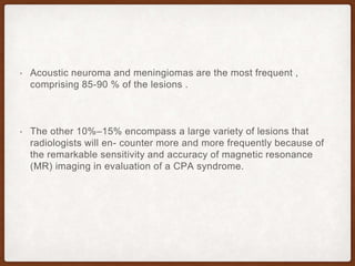 The document discusses various lesions that can occur in the cerebellopontine angle region. The most common are acoustic neuromas and meningiomas, comprising 85-90% of lesions. Other lesions discussed include vestibular schwannomas, meningiomas, epidermoid cysts, dermoid cysts, arachnoid cysts, lipomas, aneurysms of posterior fossa arteries, and miscellaneous meningeal lesions such as carcinomatous meningitis. Key imaging features of each type of lesion are provided to help with differential diagnosis.