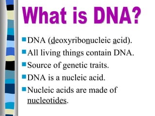 DNA contains the genetic instructions for all living things. It is made up of nucleotides, which are composed of phosphate, sugar, and one of four nitrogen bases (adenine, cytosine, guanine, thymine). DNA exists as a double helix structure, with the bases bonding together in specific base pairs. DNA replicates itself before cells divide, and mutations can occasionally occur during this process, potentially causing genetic disorders or diseases. Genes within DNA code for proteins, which carry out all the functions of life. The DNA code is transcribed into RNA and then translated to synthesize proteins through a multi-step process.