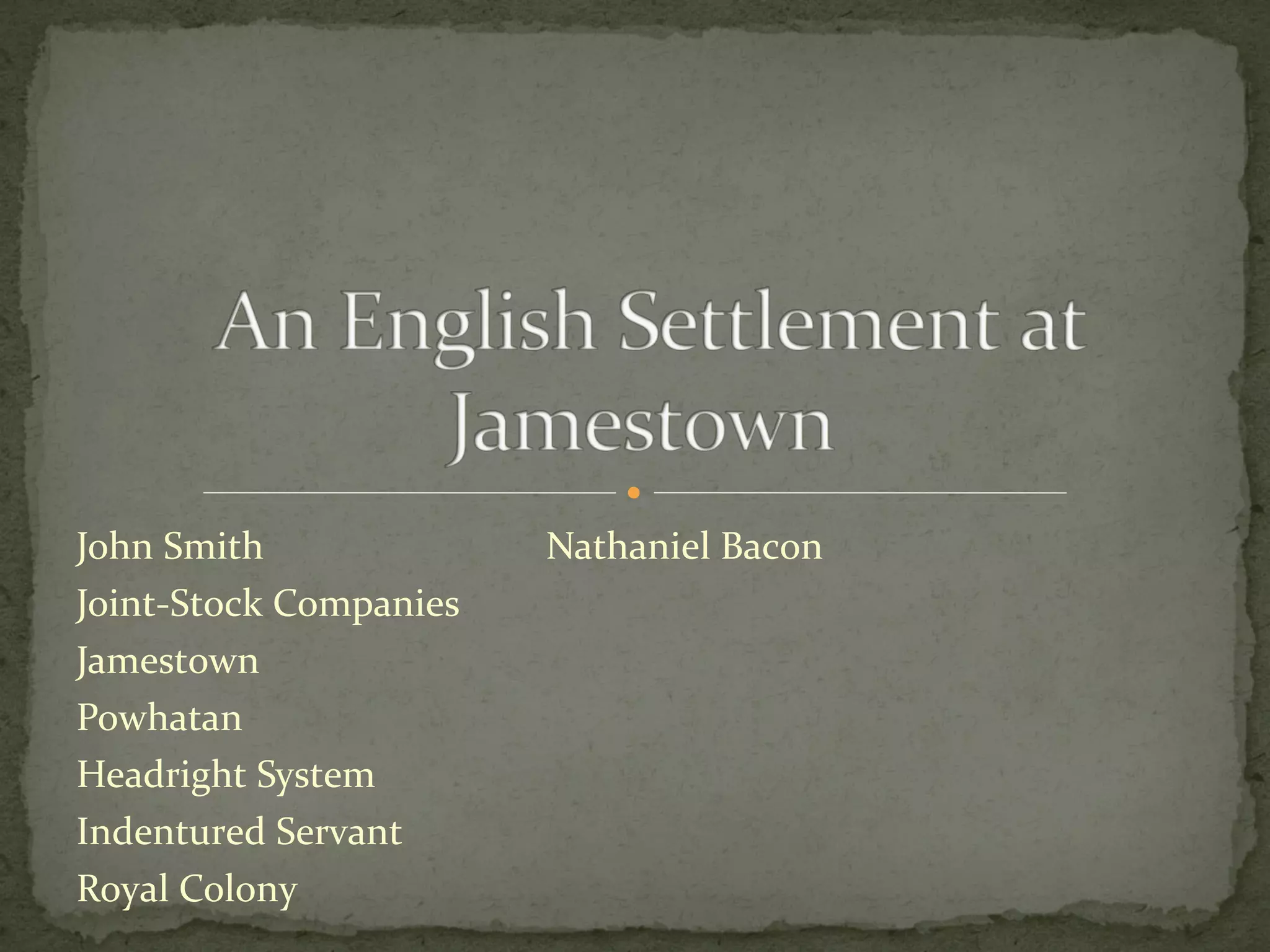1) It discusses the founding of Jamestown in 1607 by the Virginia Company and the early struggles the colony faced, including a "starving time" period.