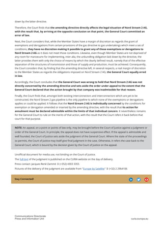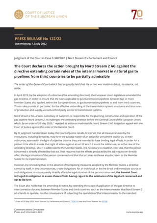The European Court of Justice ruled on an appeal from Nord Stream 2 AG against the General Court's rejection of its action against an EU directive extending gas pipeline regulations. The Court found that the directive directly affects Nord Stream 2 AG's legal situation by subjecting its planned pipeline to EU rules. It set aside parts of the General Court's ruling and referred the case back for a decision on the merits. Specifically, the directive subjects Nord Stream 2 to unbundling and third-party access rules without leaving discretion for exemptions. As the only planned new pipeline, Nord Stream 2 AG has individual concern over the directive's conditions.