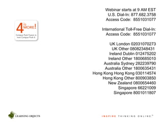 The document summarizes an online webinar about upgrading to Campus Pack 4. It provides details on the webinar time, presenter, and agenda. The summary highlights new features like personal learning spaces, community areas, enhanced course tools, and integration with multiple learning management systems. It also notes that core Campus Pack functionality remains the same.