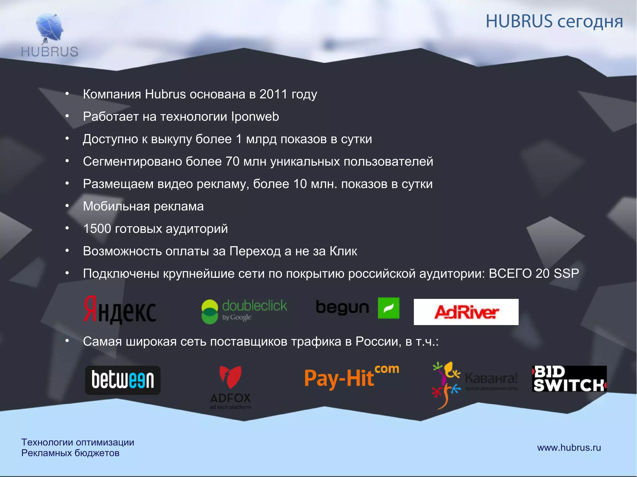 Компания Hubrus, основанная в 2011 году, предоставляет технологии оптимизации рекламных бюджетов, включая ретаргетинг и автотаргетинг, с доступом к более чем 1 миллиард показы в сутки. Платформа сегментирует более 70 миллионов уникальных пользователей и предлагает свыше 1500 готовых аудиторий для повышения эффективности рекламы. Также используется система автоматического анализа данных о посетителях и гео-таргетинг для точного определения целевой аудитории.