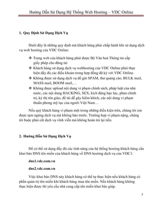 Tài liệu cung cấp hướng dẫn chi tiết về cách sử dụng hệ thống web hosting của VDC Online, bao gồm quản lý tài khoản FTP, cơ sở dữ liệu MySQL, email và bảo mật. Nó cũng đề ra các quy định sử dụng dịch vụ mà khách hàng phải tuân thủ. Ngoài ra, tài liệu hướng dẫn cách cấu hình tên miền và thông tin đăng nhập cho người dùng.