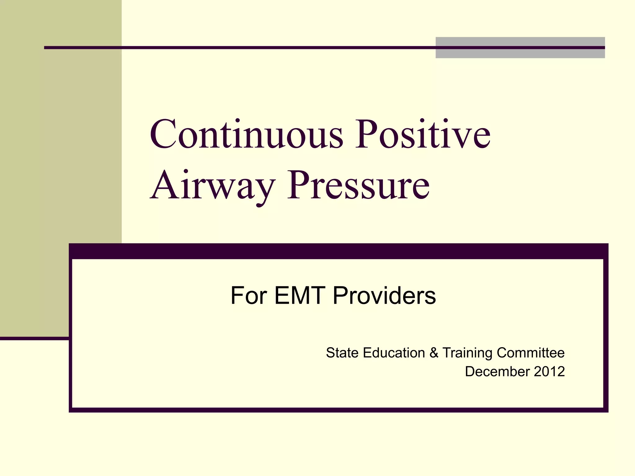 The document provides education on using continuous positive airway pressure (CPAP) devices to treat patients experiencing respiratory distress or failure, outlining the anatomy and physiology of respiration, common respiratory disorders, how CPAP works to apply positive pressure and alleviate symptoms, appropriate indications and contraindications for its use, and tips for effective operation of CPAP devices in the pre-hospital setting. The goal is for EMT providers to correctly utilize CPAP to improve oxygenation and reduce the workload of breathing for compromised patients.