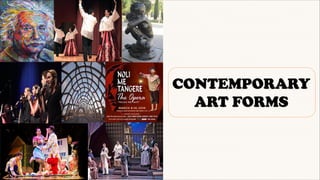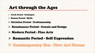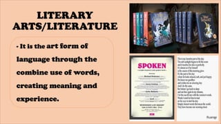 The document defines the arts as the expression of human creativity and imagination through various creative works and mediums intended to be appreciated for their beauty or emotional impact. It lists several categories of the arts - dance, music, visual arts, theater, literary arts, architecture, and film. It then provides some brief examples within those categories that are specific to Philippine culture and history, such as Tinikling, Cariñosa, Rondalla, Ryan Cayabyab, painting, sculpture, Fort Santiago, and the Philippine Arena.