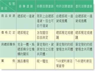 本文探讨了微型创业和连锁加盟的经营特点,概述了连锁发展的优势和劣势,以及特许加盟和其相关类型的定义。强调了总部与加盟者之间的合作关系、市场拓展及存在的潜在风险,并指出成功的加盟与多因素相关,非绝对保证。最后讨论了国内连锁业者进军海外市场的考虑因素,如文化相似性和对当地市场的熟悉度。