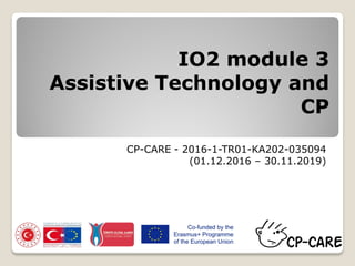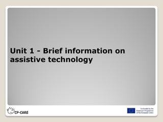 The document discusses assistive technology for individuals with cerebral palsy, detailing various devices and systems that support mobility, communication, and daily activities. It covers categories of technology, including no-tech, low-tech, and high-tech solutions, as well as specific aids for different bodily functions. Additionally, it emphasizes the importance of tailored adaptive equipment to enhance the independence and quality of life for users.