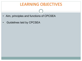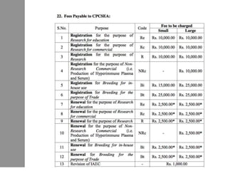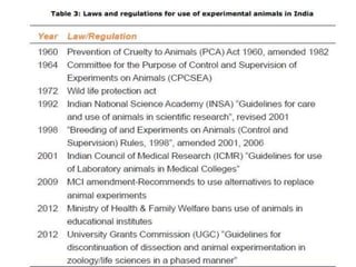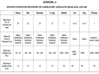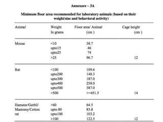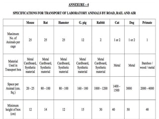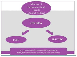 The document discusses guidelines from the Committee for the Purpose of Control and Supervision of Experiments on Animals (CPCSEA) in India. It outlines CPCSEA's aim to promote humane care of animals used in research while advancing biological knowledge. Key points include CPCSEA introducing Good Laboratory Practice standards and the 3Rs principles of replacement, reduction and refinement of animal use. Guidelines cover proper housing, care, experimental procedures, record keeping and humane euthanasia to minimize animal suffering.