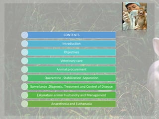 The document summarizes guidelines from various organizations regarding the use of animals in research and experiments, including CPCSEA, ICMR, and INSA. It outlines standards for veterinary care, housing and facilities, disease prevention and treatment, record keeping, anesthesia, euthanasia, and other procedures to ensure the humane treatment of laboratory animals and that unnecessary pain or suffering is avoided. The guidelines are intended to properly oversee and regulate experimentation on animals.