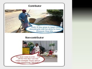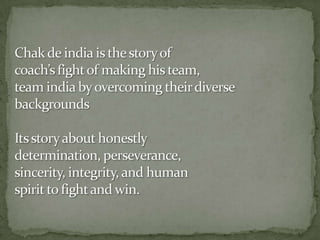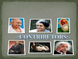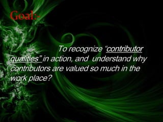 This document is a presentation about contributor qualities. It lists 6 student names and then discusses the characteristics of a good contributor, including their ability to create value for others, design solutions, focus on goals over routine tasks, commit fully to their responsibilities, and act appropriately in different situations. It notes that contributors demonstrate concern for others, take responsibility for solving problems, have a wide view of their work, and focus on the team's goals over personal success. The presentation concludes by stating that teachers exemplify contributor qualities and references the movie "Chak De India".