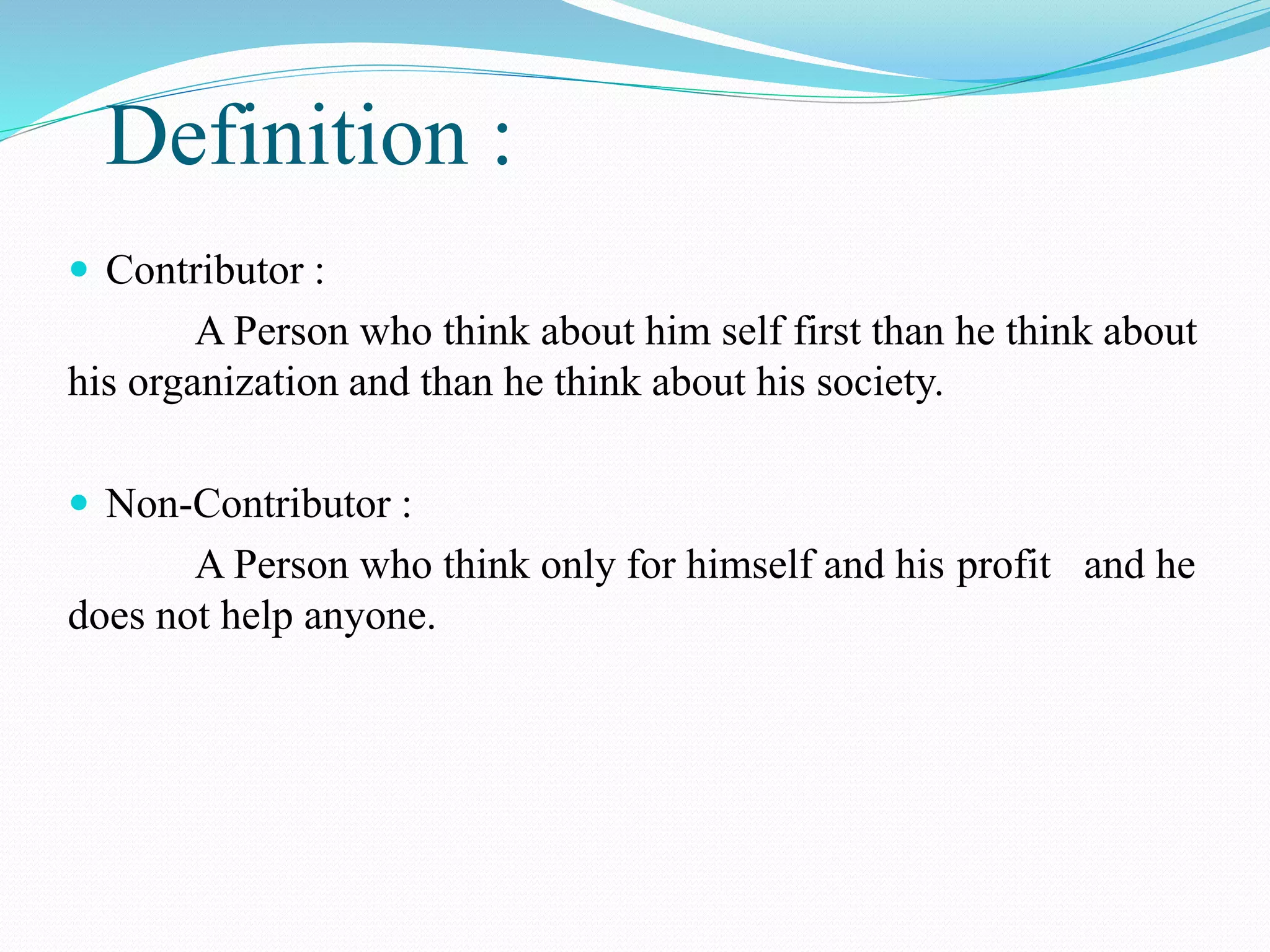 The document defines a contributor as someone who prioritizes their organization and society over themselves, and helps others. A non-contributor only thinks of themselves and their own profit. Examples provided show that a contributor teacher cares for students' futures and understanding, while a non-contributor teacher only cares about salary. A contributor government officer speaks politely and considers people's situations, unlike a non-contributor officer. A contributor sweeper takes pride in keeping the environment clean for the community, unlike a non-contributor who sees it just as a job. A contributor team member prioritizes team success over personal success and does not let ego interfere.