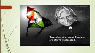 Dr. A.P.J. Abdul Kalam was an Indian scientist and administrator who served as the 11th President of India. He worked as an aerospace engineer with Defense Research and Development Organization (DRDO) and Indian Space Research Organization (ISRO), earning him the title of "Missile Man of India" for his work on missile projects. He received many prestigious awards including India's highest civilian honor, the Bharat Ratna. Currently he is a professor at several universities and actively promotes education and development through his writings and public speeches focused on inspiring youth.