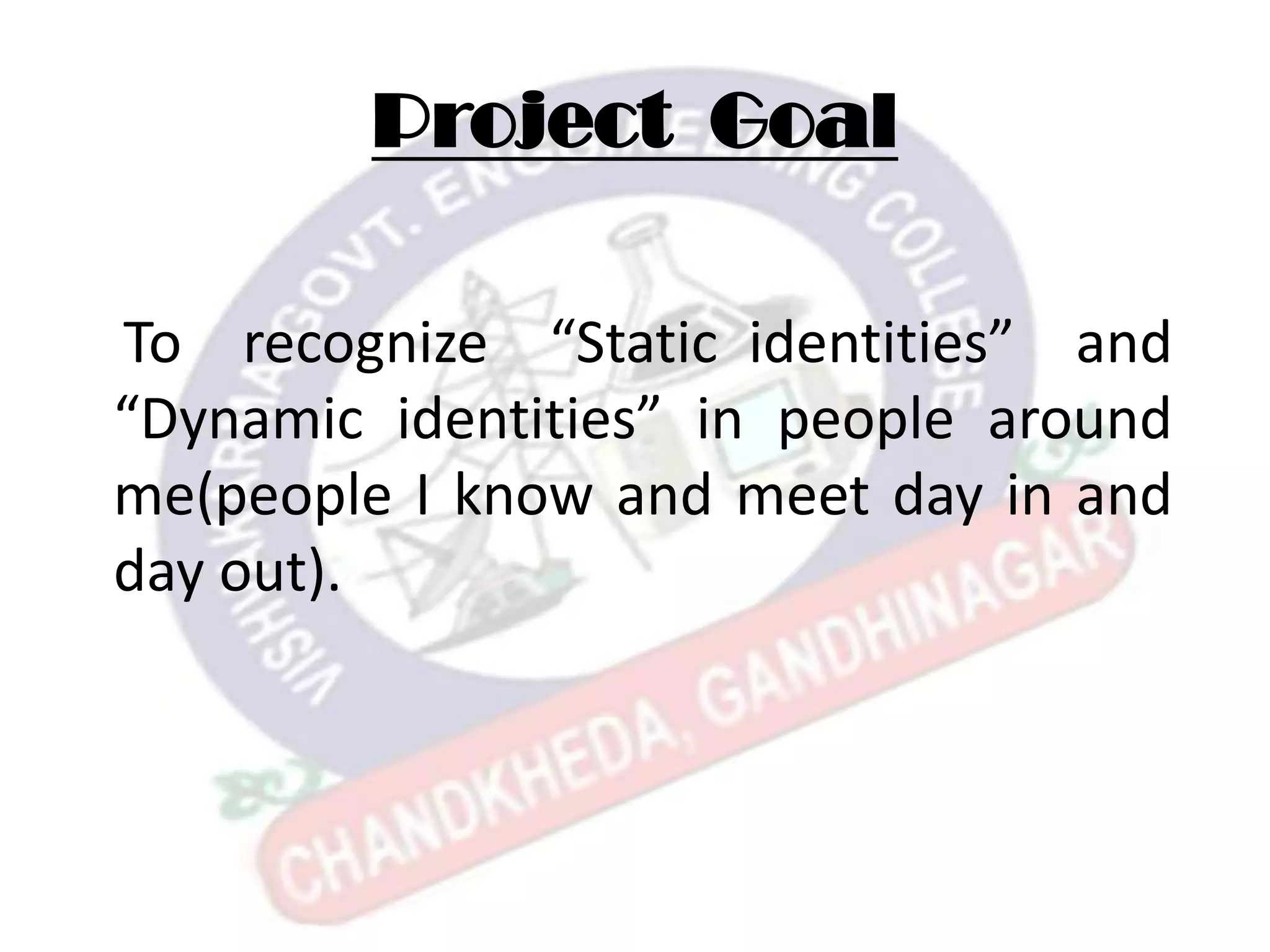The document provides details about a student's project to recognize static and dynamic identities. It defines static identity as one that does not change based on qualifications, awards, power, past achievements or knowledge gained. Dynamic identity undergoes important changes based on understanding, commitment, values, potential contribution, responsibilities, and willingness to learn. It observes three persons - Mr. X with dynamic identity, Mr. Y with static identity, and Mr. Z with a combination. The conclusion is that a contributor's self-image is defined not by past achievements but by potential to make a positive difference, focus on responsibilities, future potential, and being a learner.